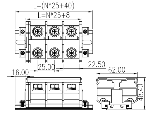 • Pitch:25.0mm,Electrical:UL,Rated Voltage:600V,Rated Current:130A,colour:black ;