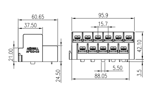 • Pitch:15.7mm,Electrical:UL,Rated Voltage:600V,Rated Current:65A,colour:black ;